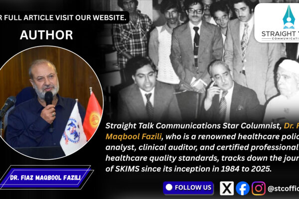 Straight Talk Communications Star Columnist, Dr. Fiaz Maqbool Fazili, who is a renowned healthcare policy analyst, clinical auditor, and certified professional in healthcare quality standards, tracks down the journey of SKIMS since its inception in 1984 to 2025. “Medicine is not a trade; it is a calling where the physician not only thinks with his…