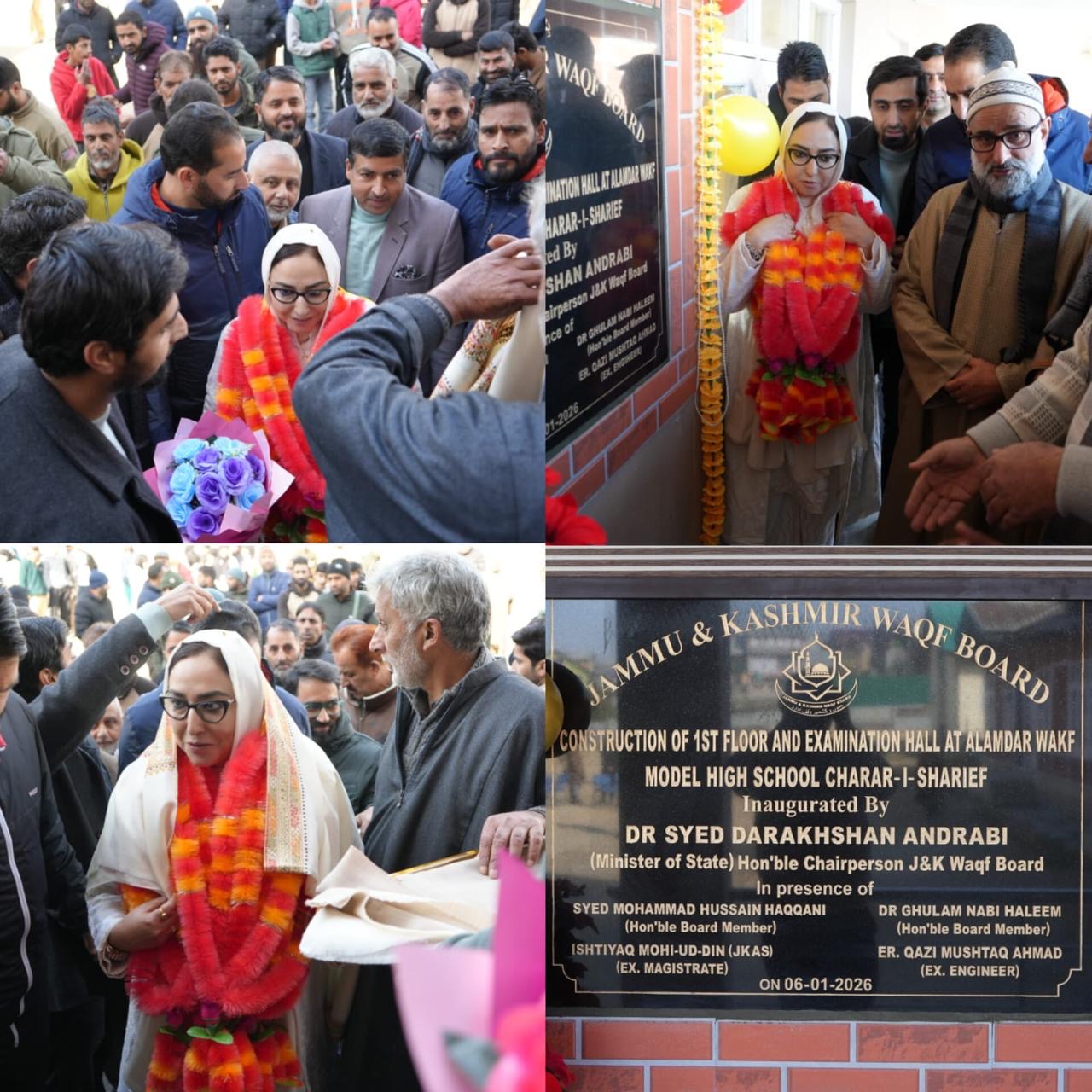 SRINAGAR, JANUARY 07 (STC): All educational institutions of the Jammu and Kashmir Waqf Board throughout the Union Territory will leverage advanced technology and start using smart classes soon, said Chairperson, J&K Waqf Board, Syed Dr. Syed Darakhshan Andrabi, (Minister of State), after inaugurating the newly constructed first floor and Examination Hall at Model Waqf School Chrar-e-Sharief yesterday.