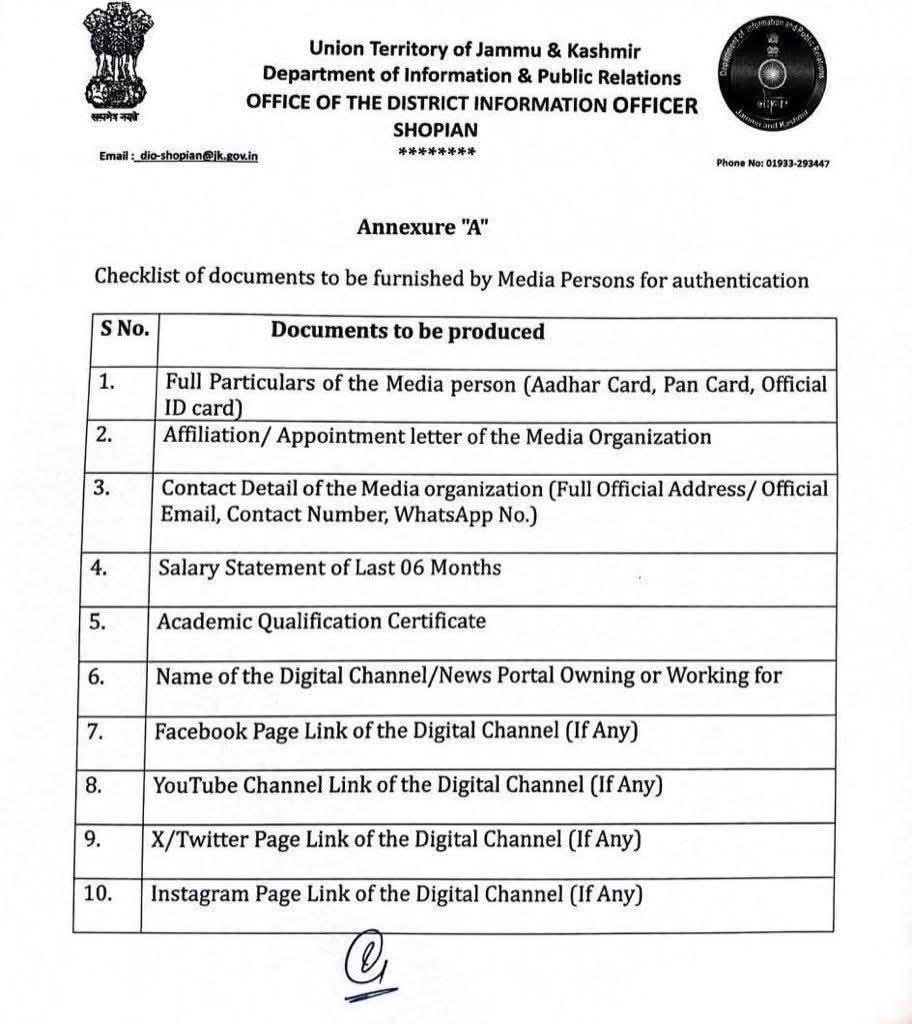 SRINAGAR, NOVEMBER 05 (STC): The District Information Office (DIO) Shopian has taken a lead to comply with the government directive to ascertain the authencity of genuine journalists operating in the region. The DIO has issued a detailed checklist of documents to be furnished by media persons operating in the district for verification and authentication.