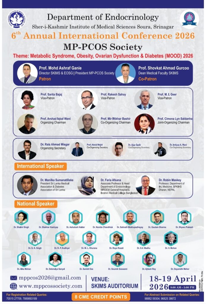 A statement of the SKIMS states that the conference is being held under the guidance of Prof. M. Ashraf Ganie, Director SKIMS and President of the MP-PCOS Society. The theme for this year’s conference, “Metabolic Syndrome, Obesity, Ovarian Dysfunction and Diabetes (MOOD 2026)”, reflects the growing global concern around interconnected metabolic and endocrine disorders, particularly among women.